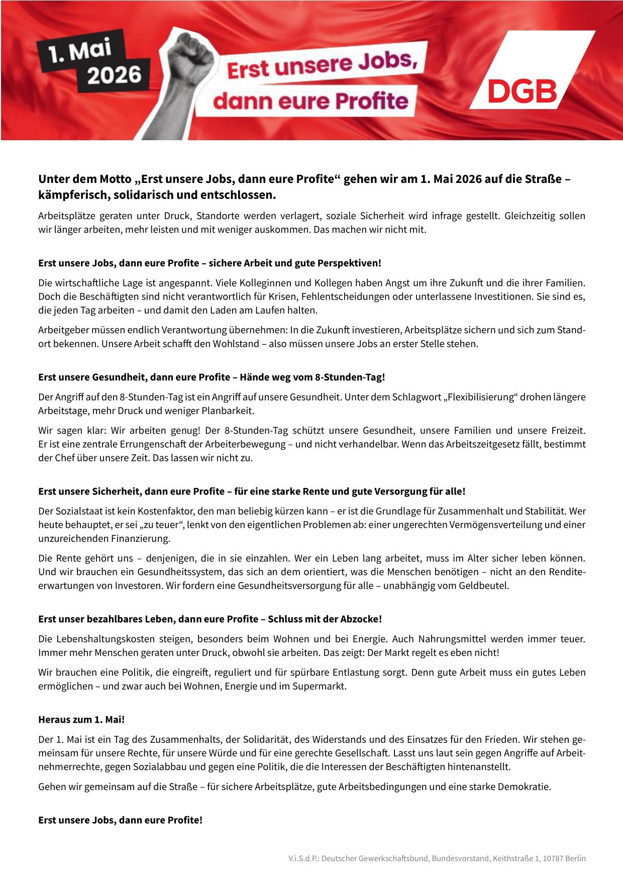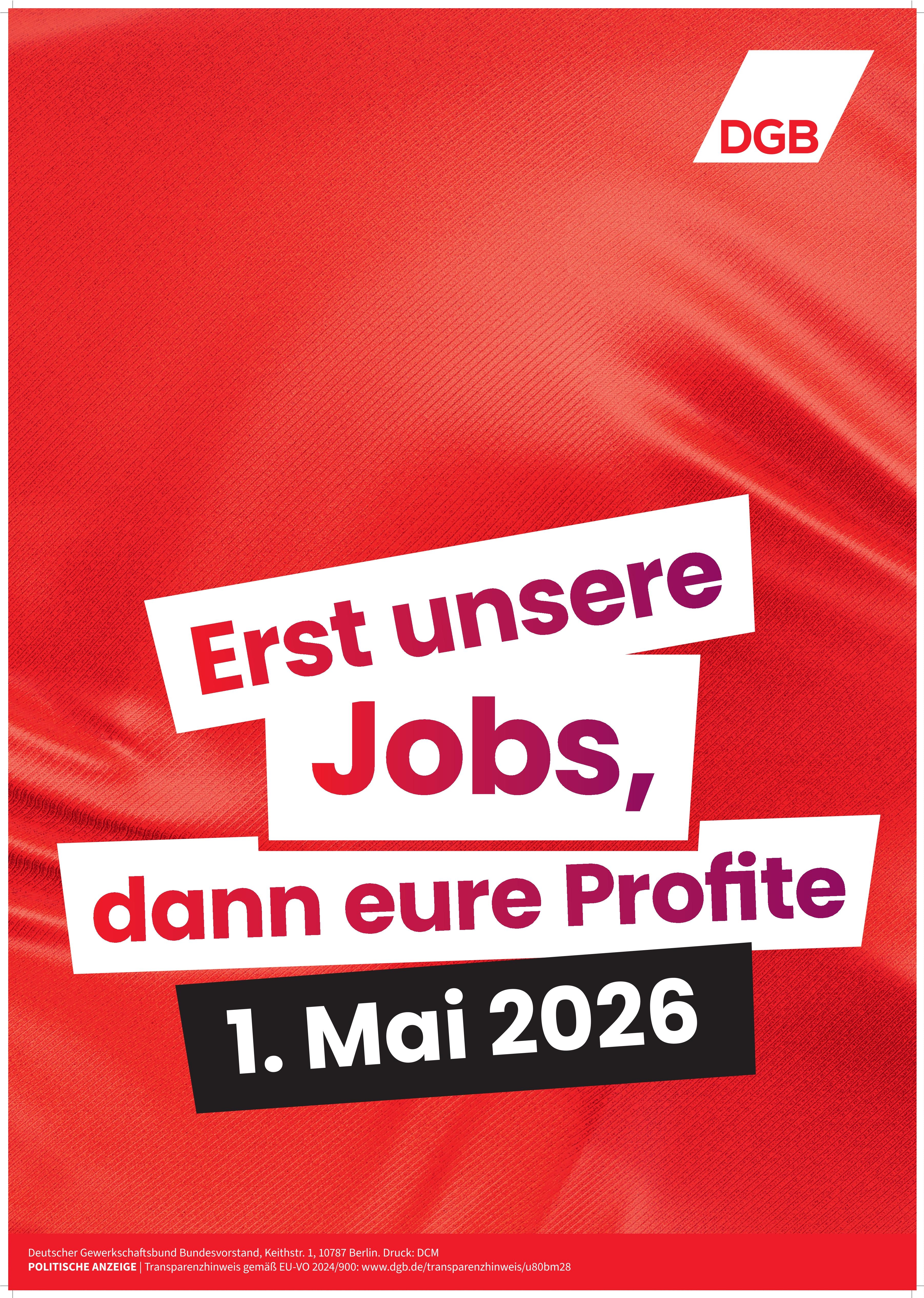 Unter dem Motto „Erst unsere Jobs, dann eure Profite“ gehen wir am 1. Mai 2026 auf die Straße in Bremen. Wir sehen uns - am Sammelpunkt für den Demozug oder auf dem Domshof!